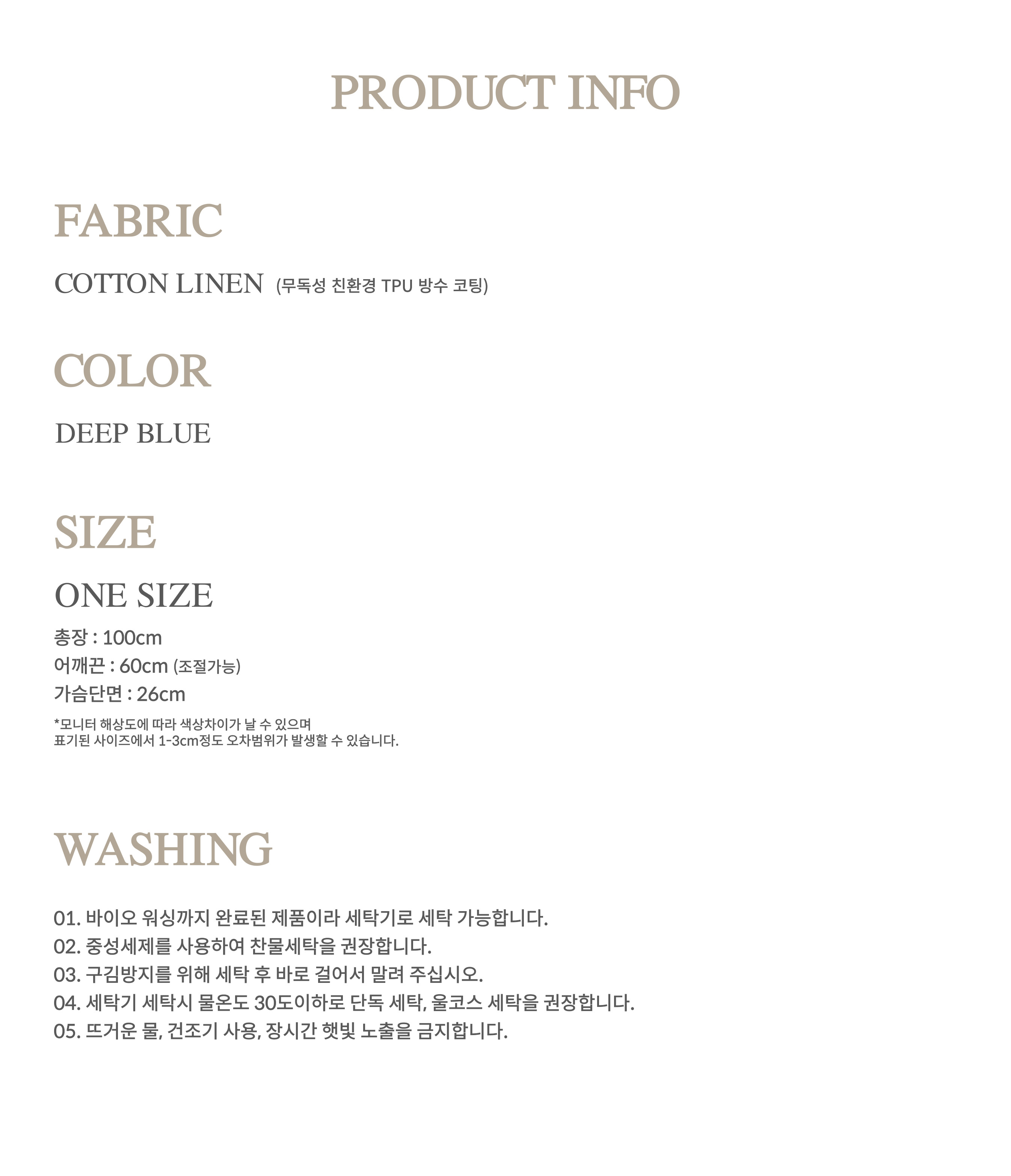 - 고급 면린넨 바이오 워싱, 무독성 친환경 TPU코팅까지 완료 된 생활 방수 앞치마
