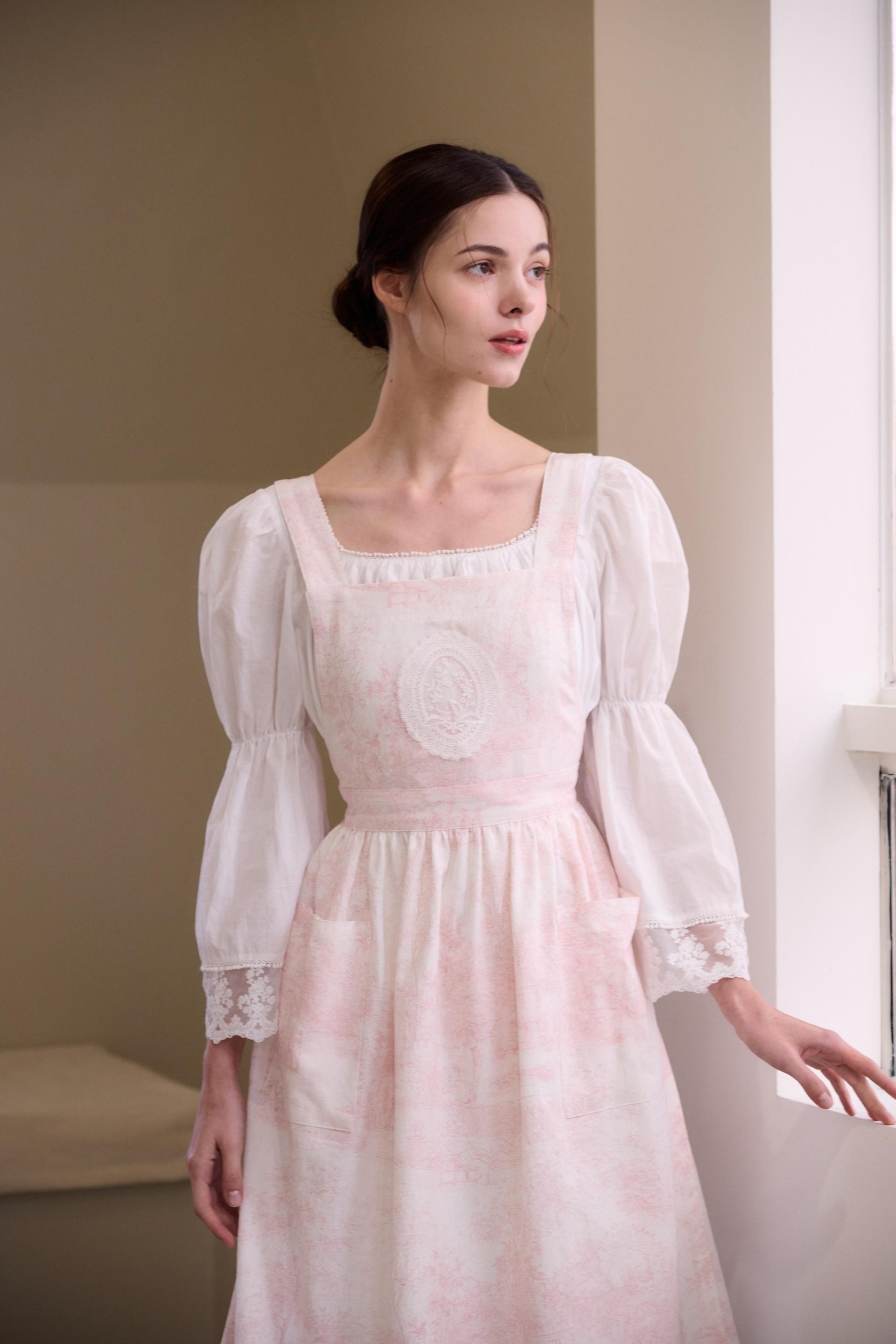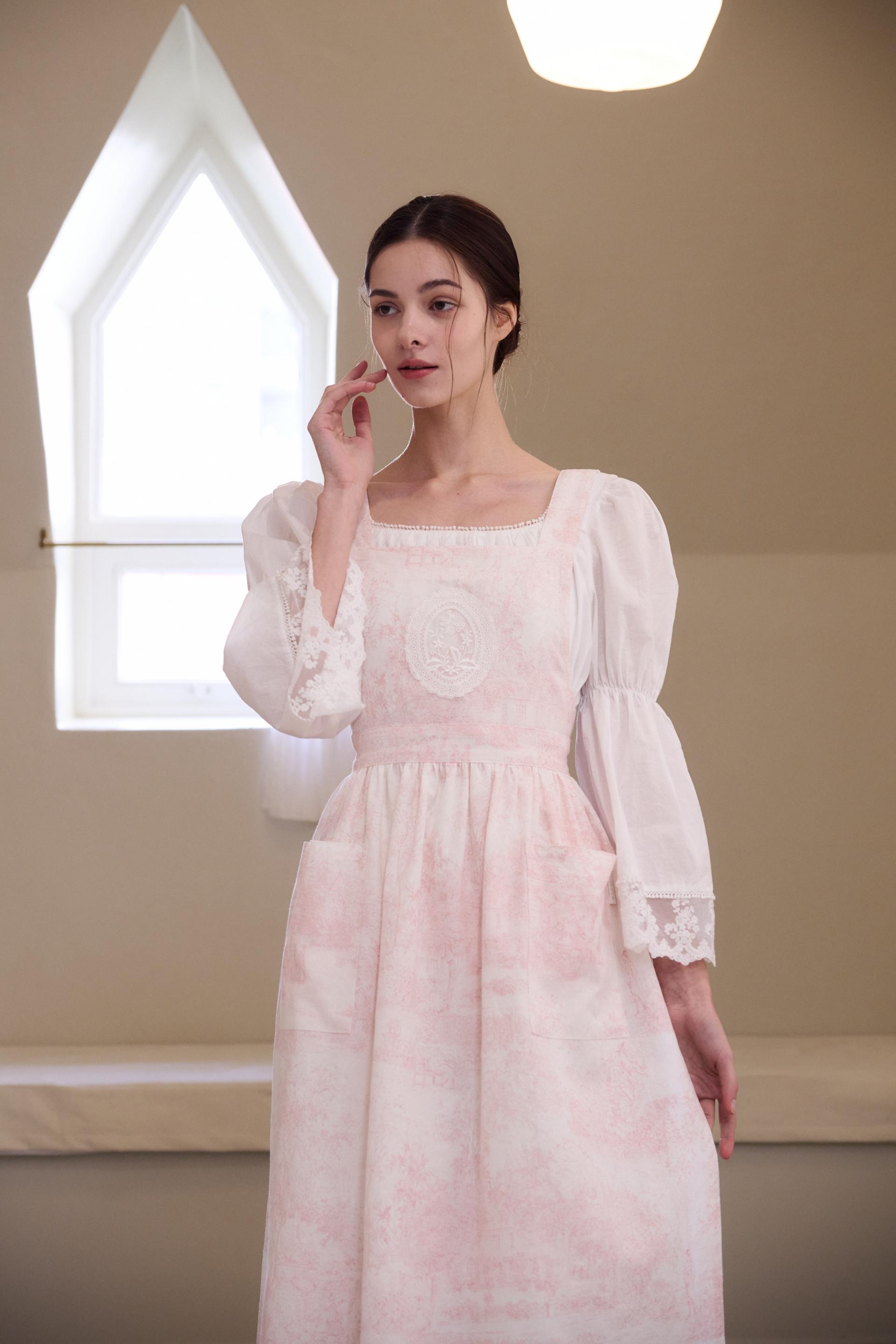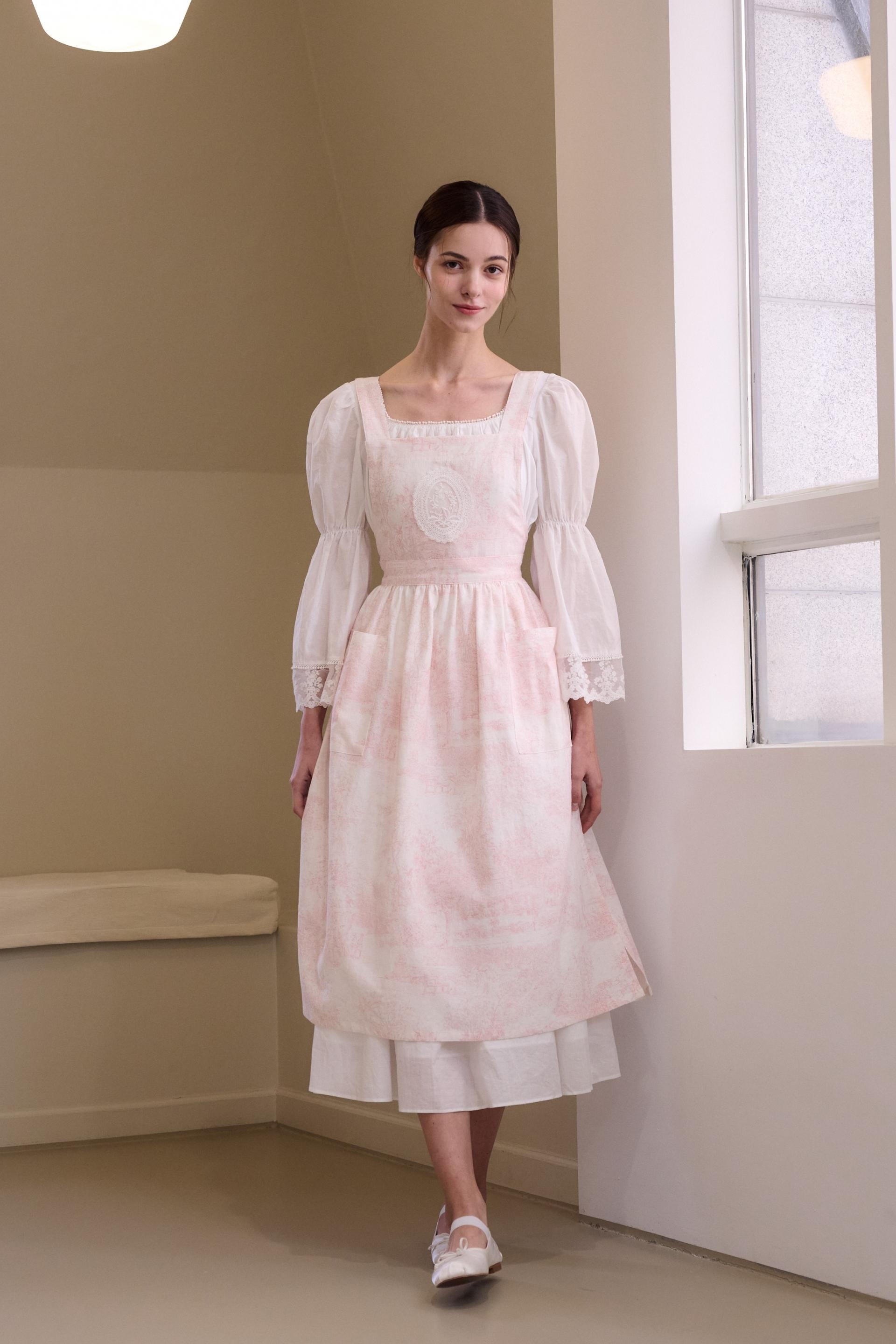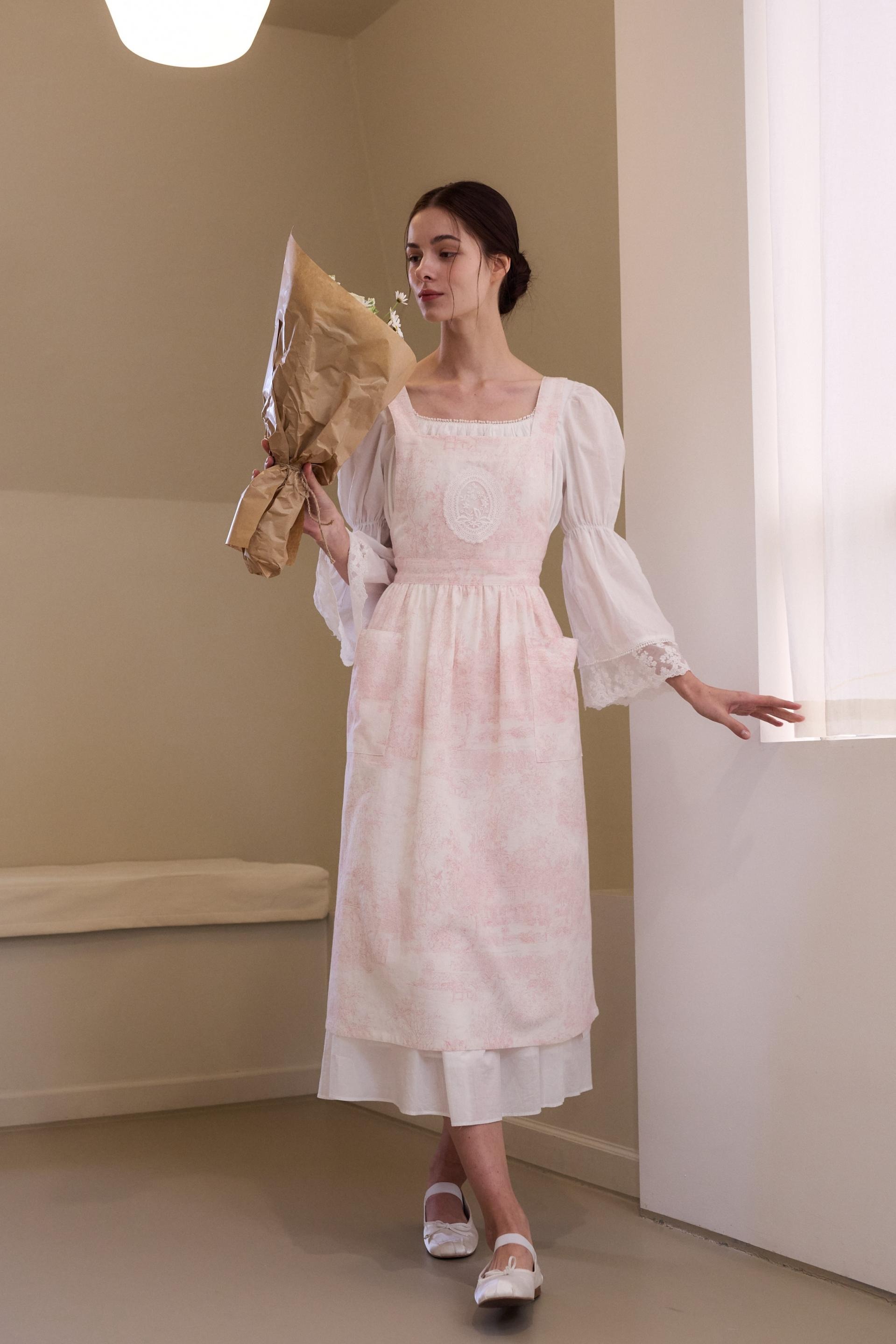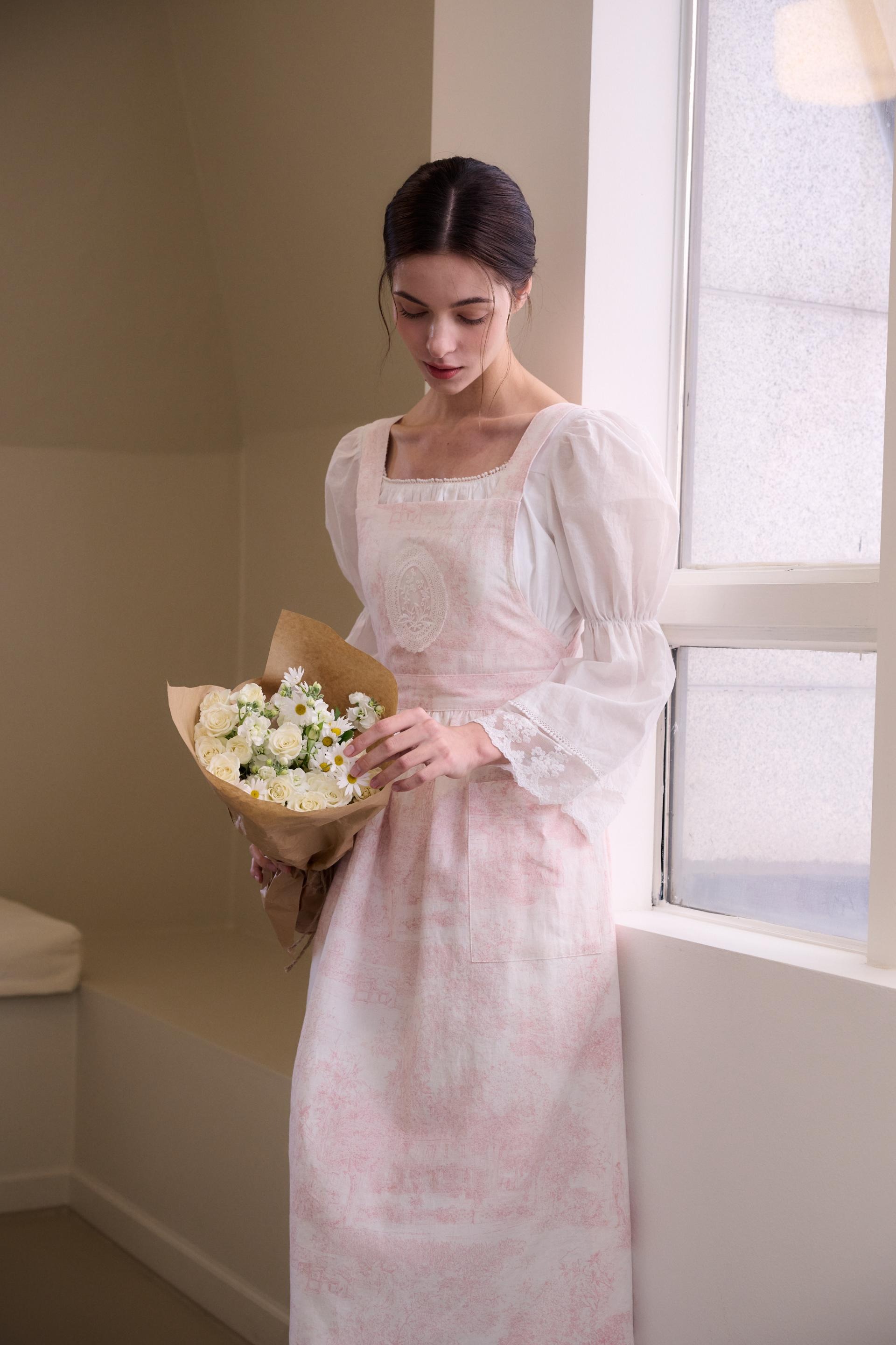- 허릿단 셔링의 포인트로 허리 라인은 잘록하고 스커트 라인은 풍성한 원피스 형 앞치마.