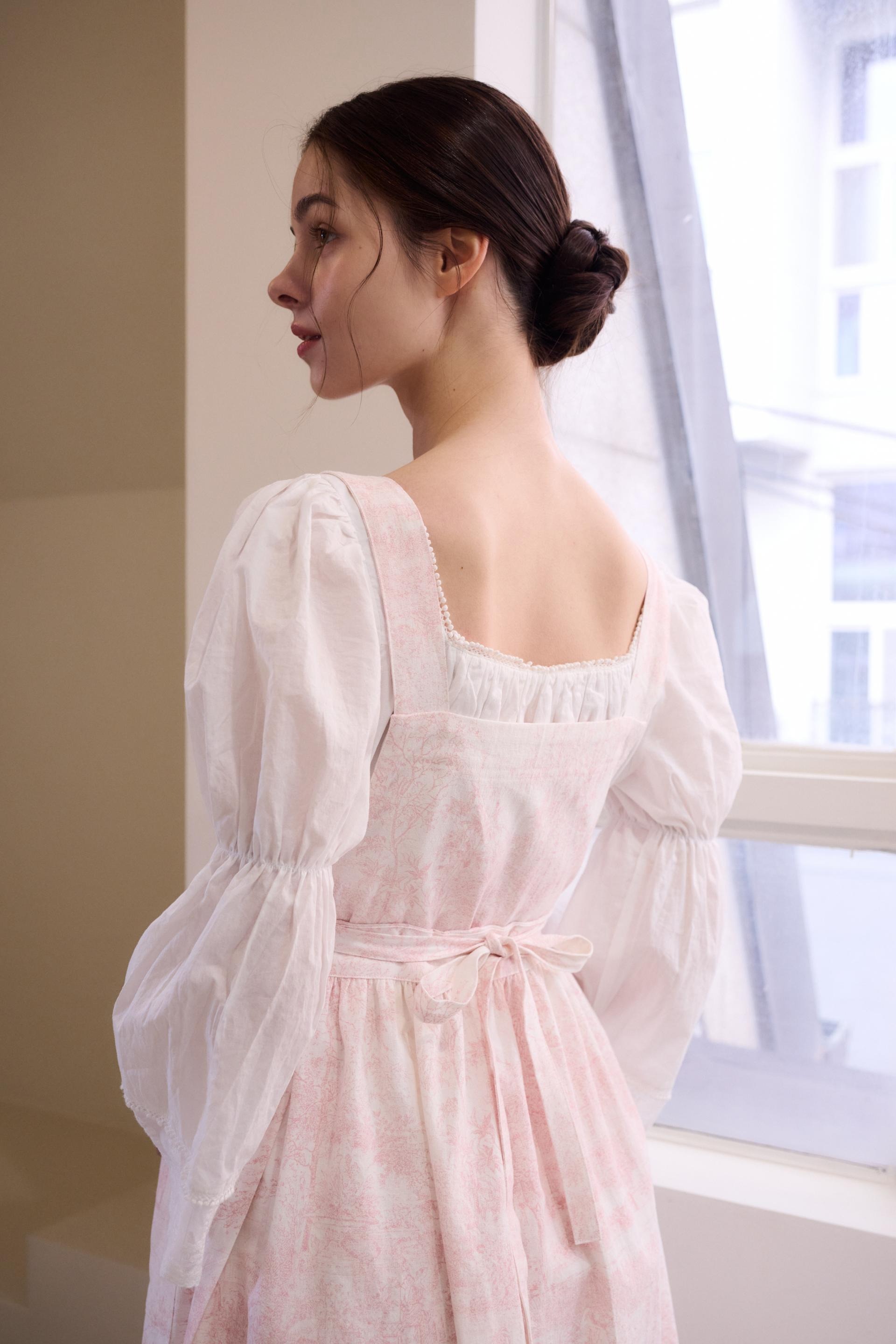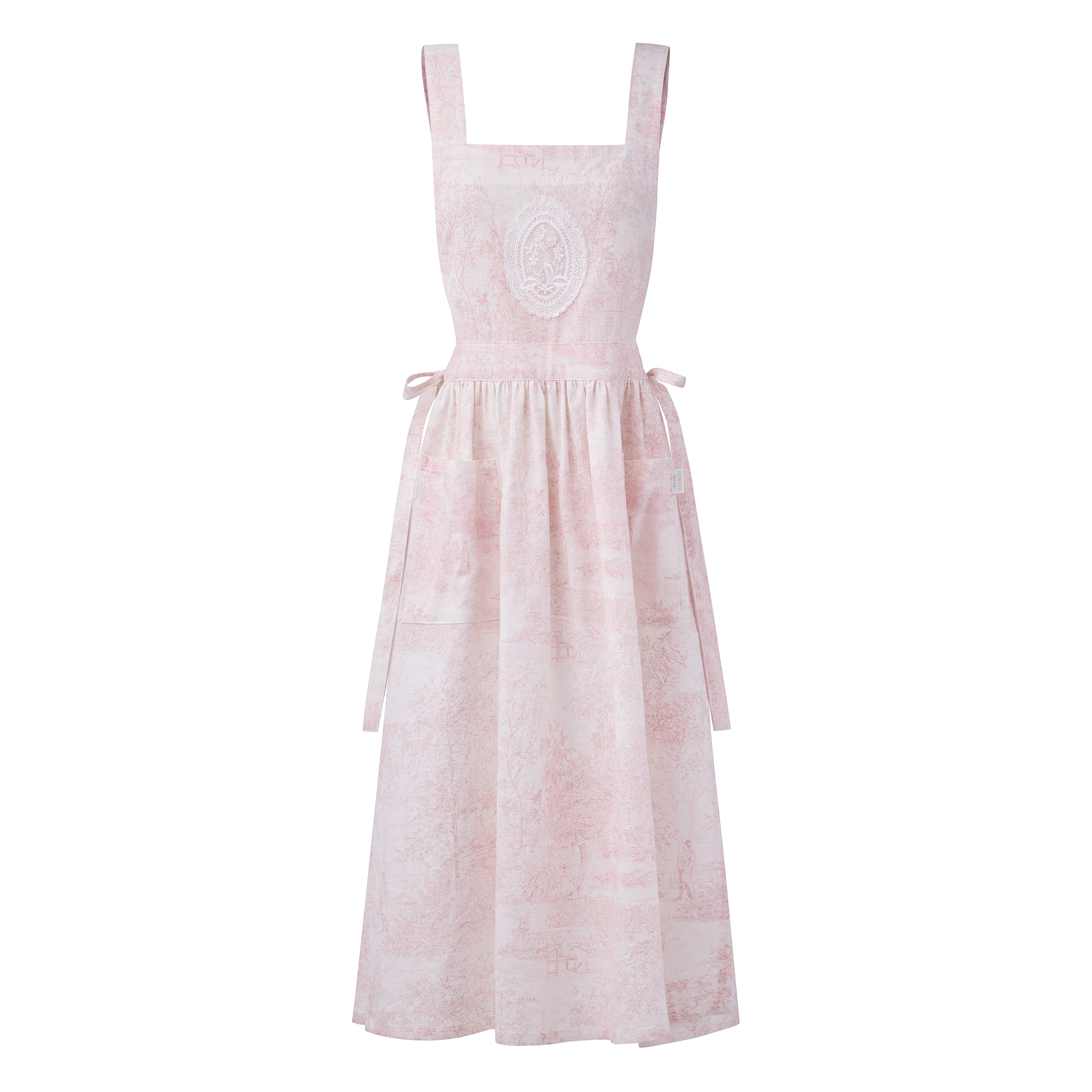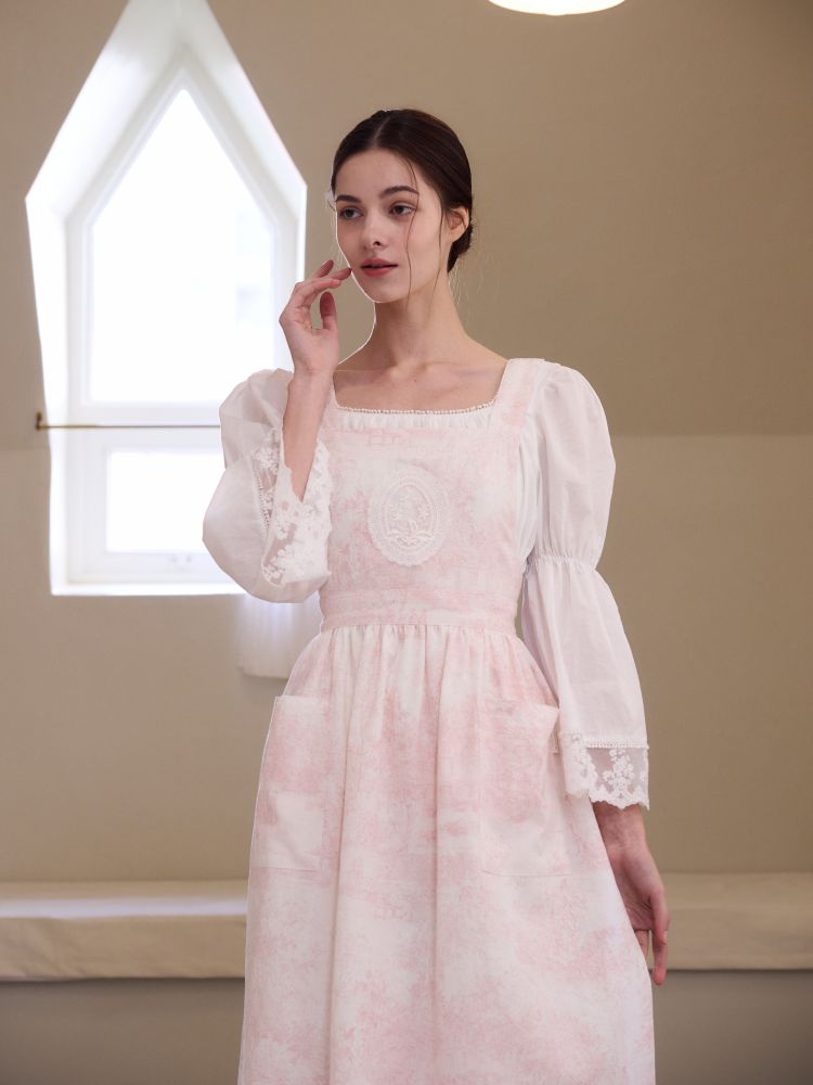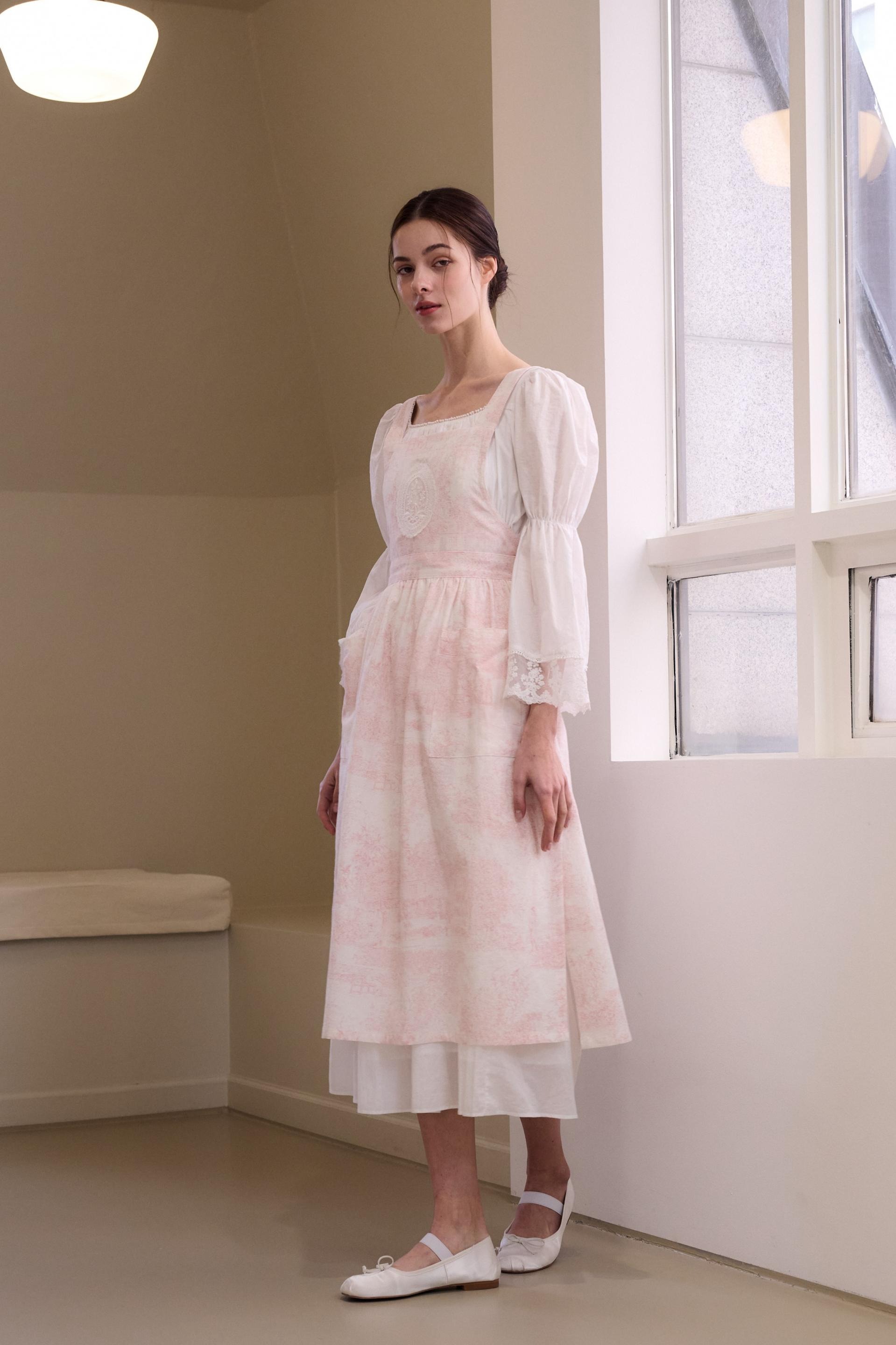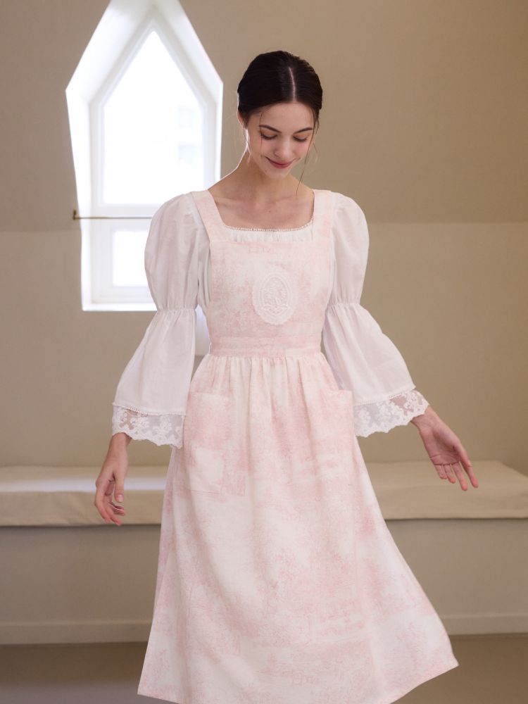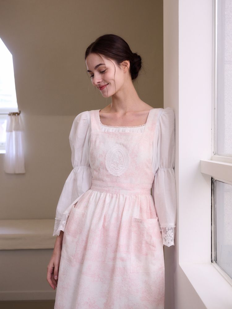 - 허릿단 셔링의 포인트로 허리 라인은 잘록하고 스커트 라인은 풍성한 원피스 형 앞치마.