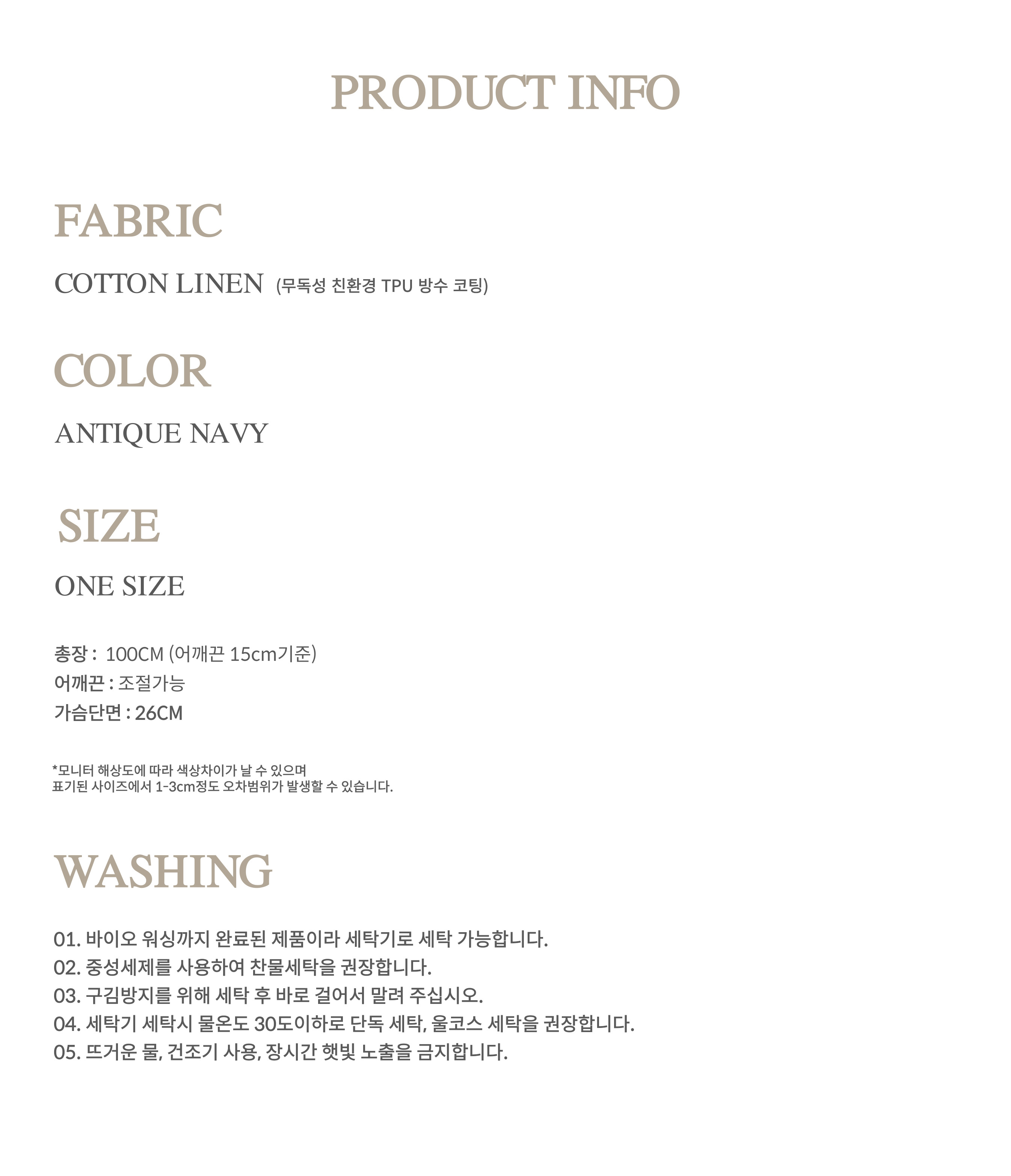 - 고급 면린넨 바이오 워싱, 무독성 친환경 TPU코팅까지 완료 된 생활 방수 앞치마