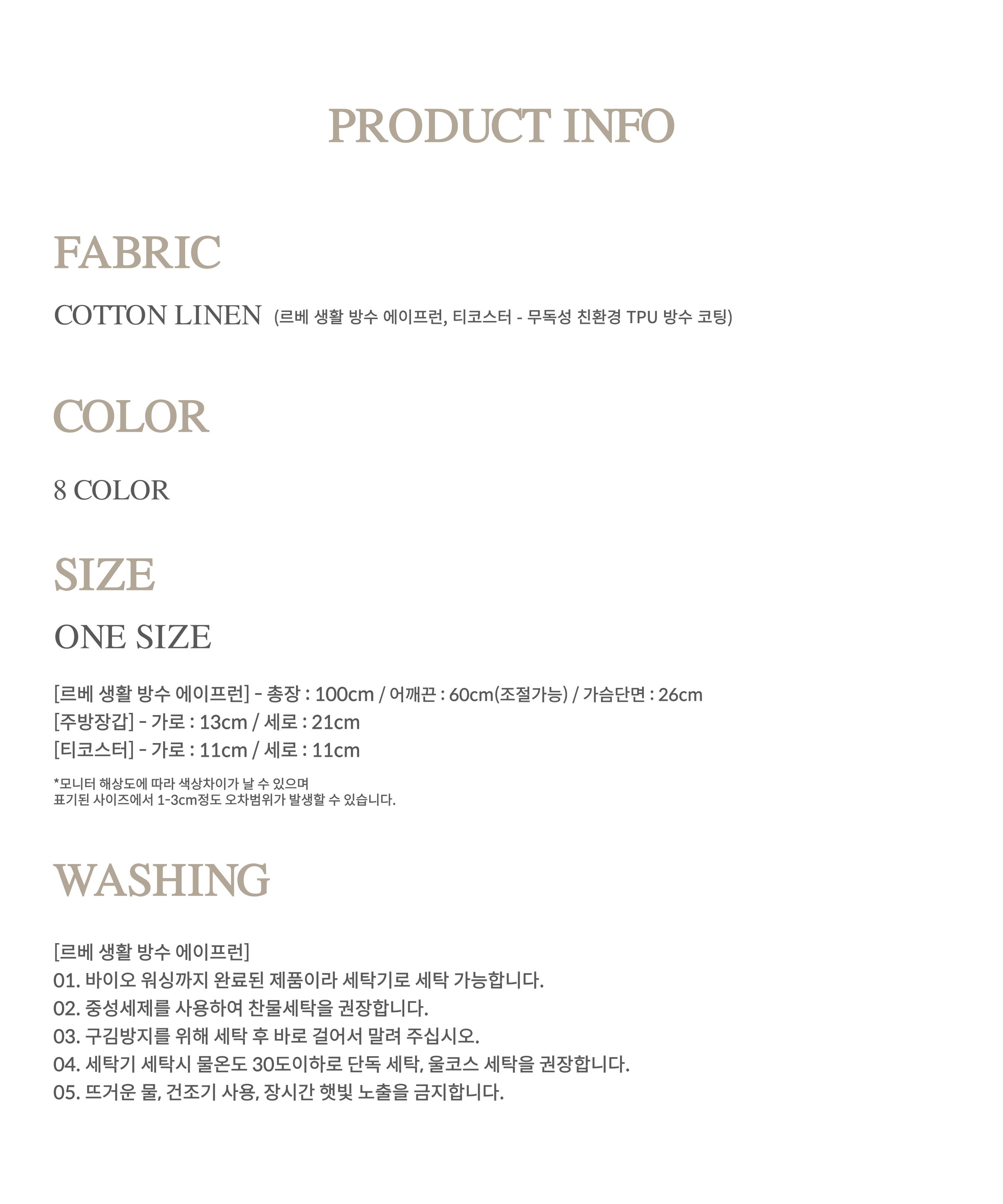 - 고급 면린넨 바이오 워싱, 무독성 친환경 TPU코팅까지 완료 된 생활 방수 앞치마