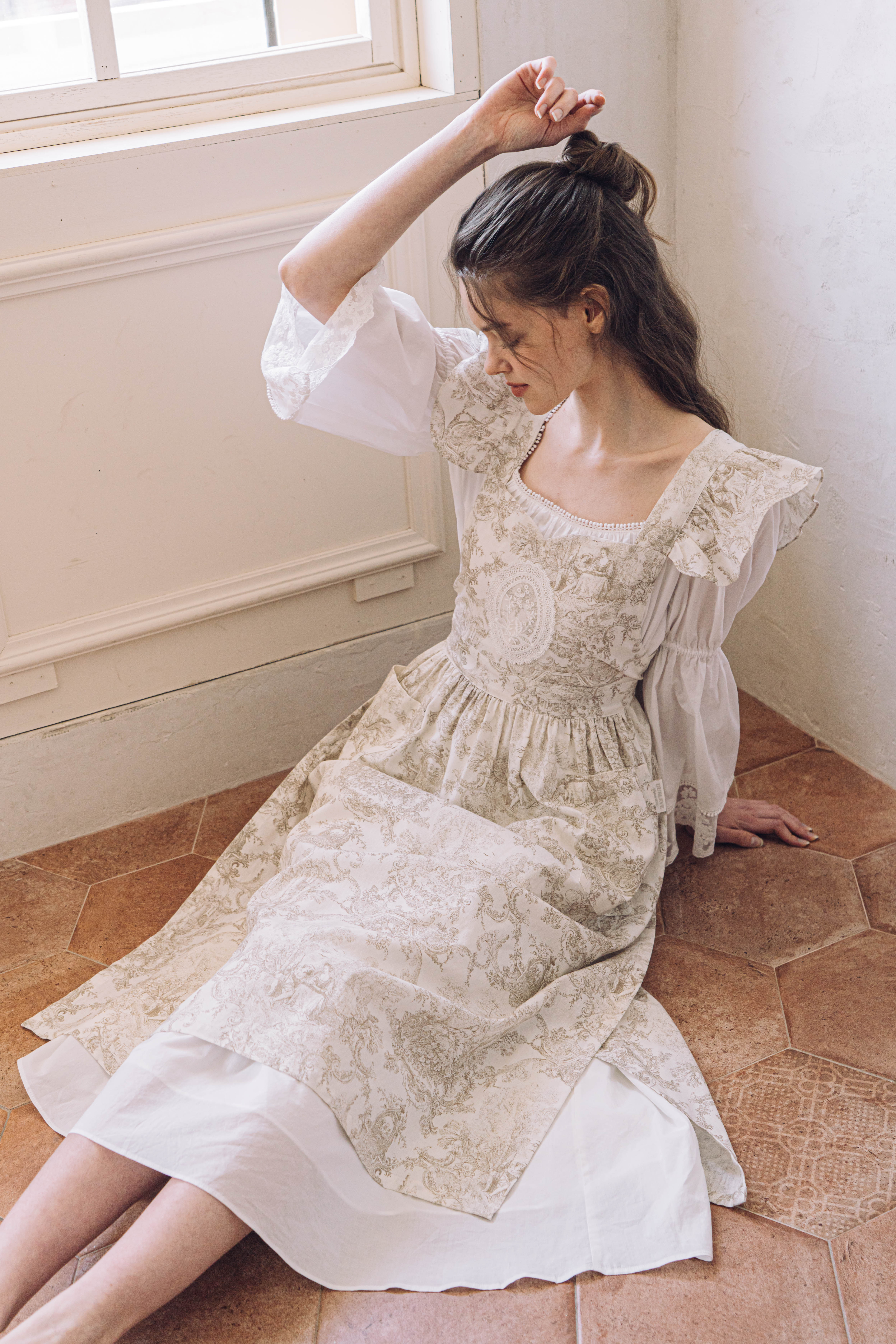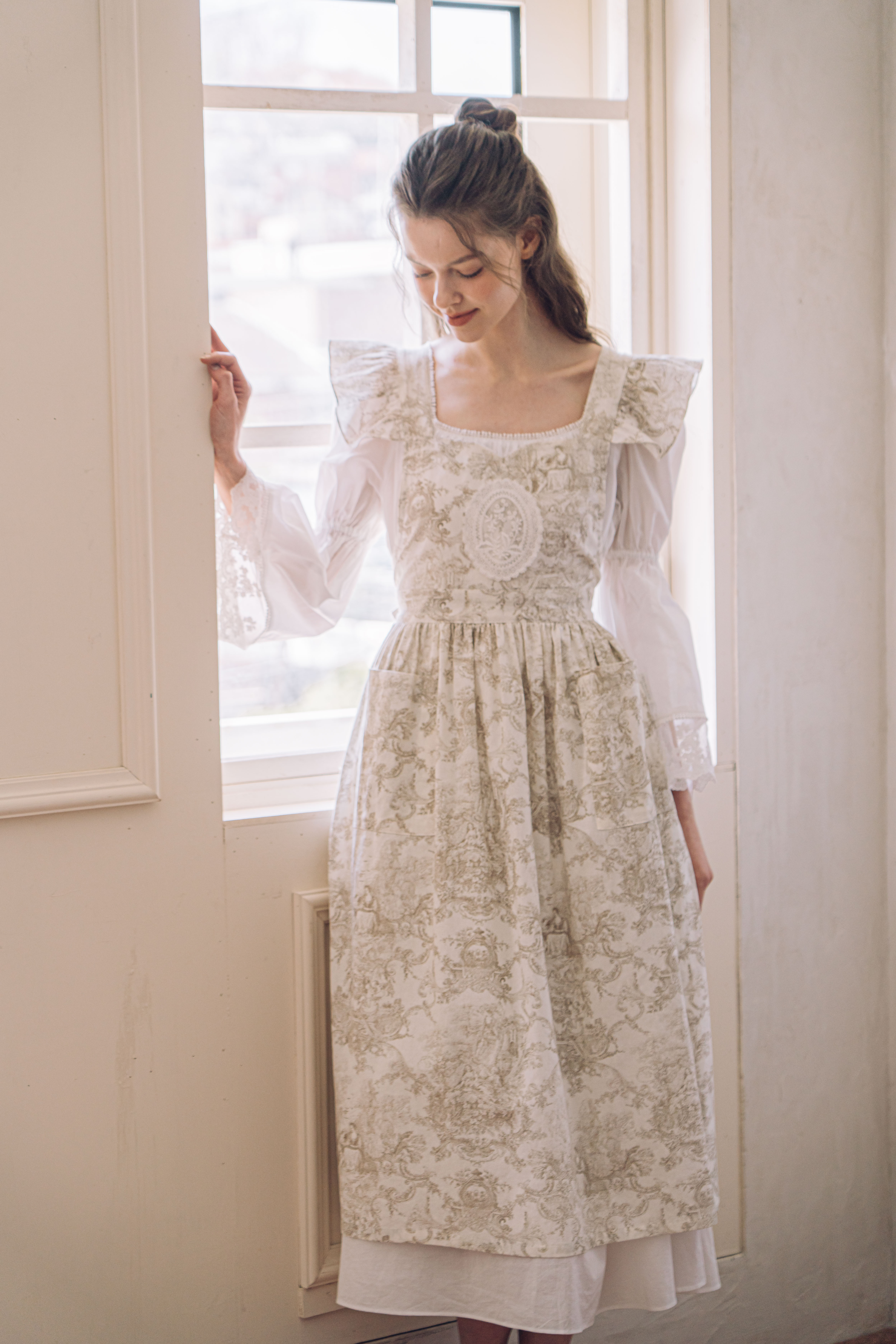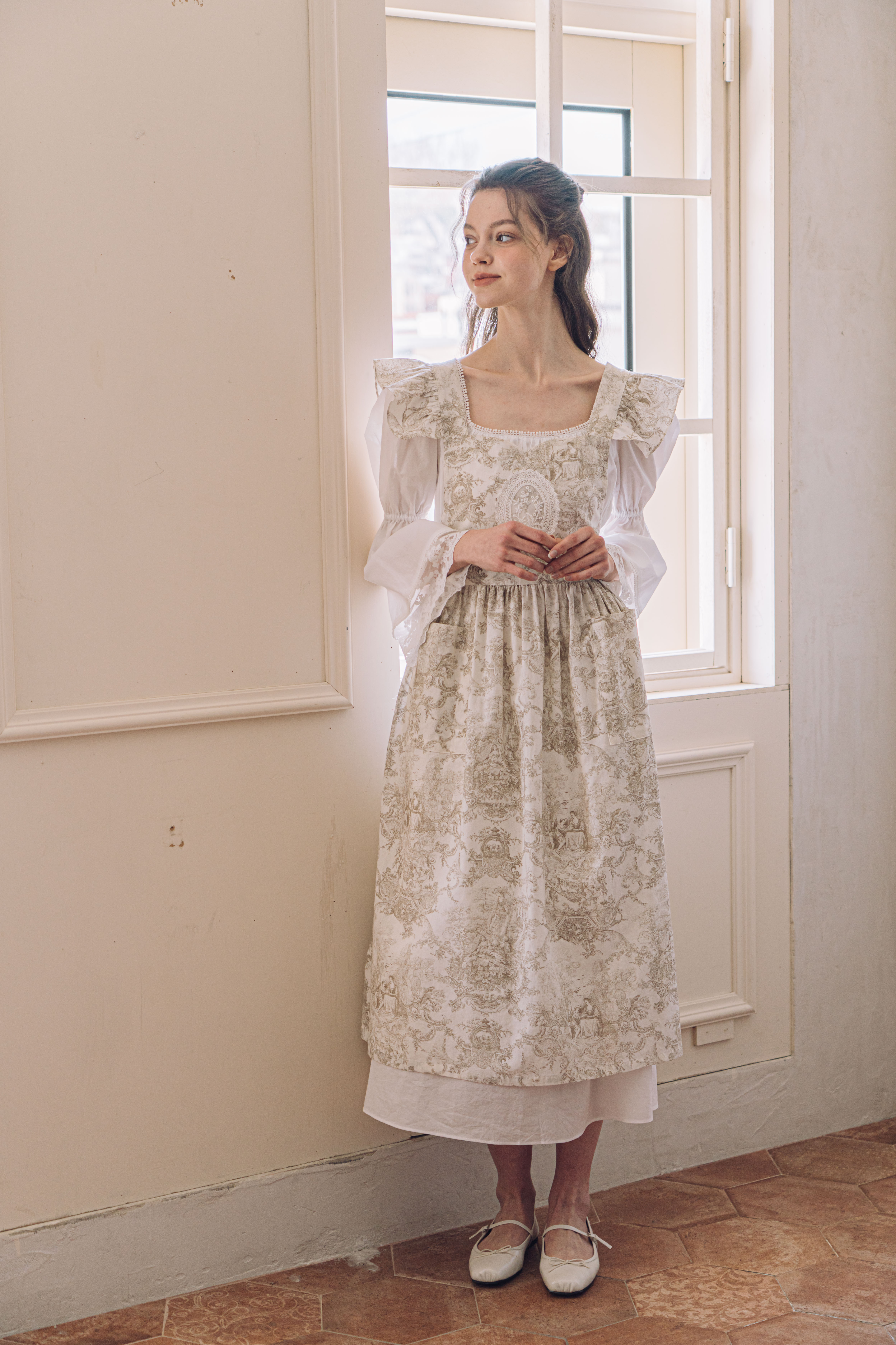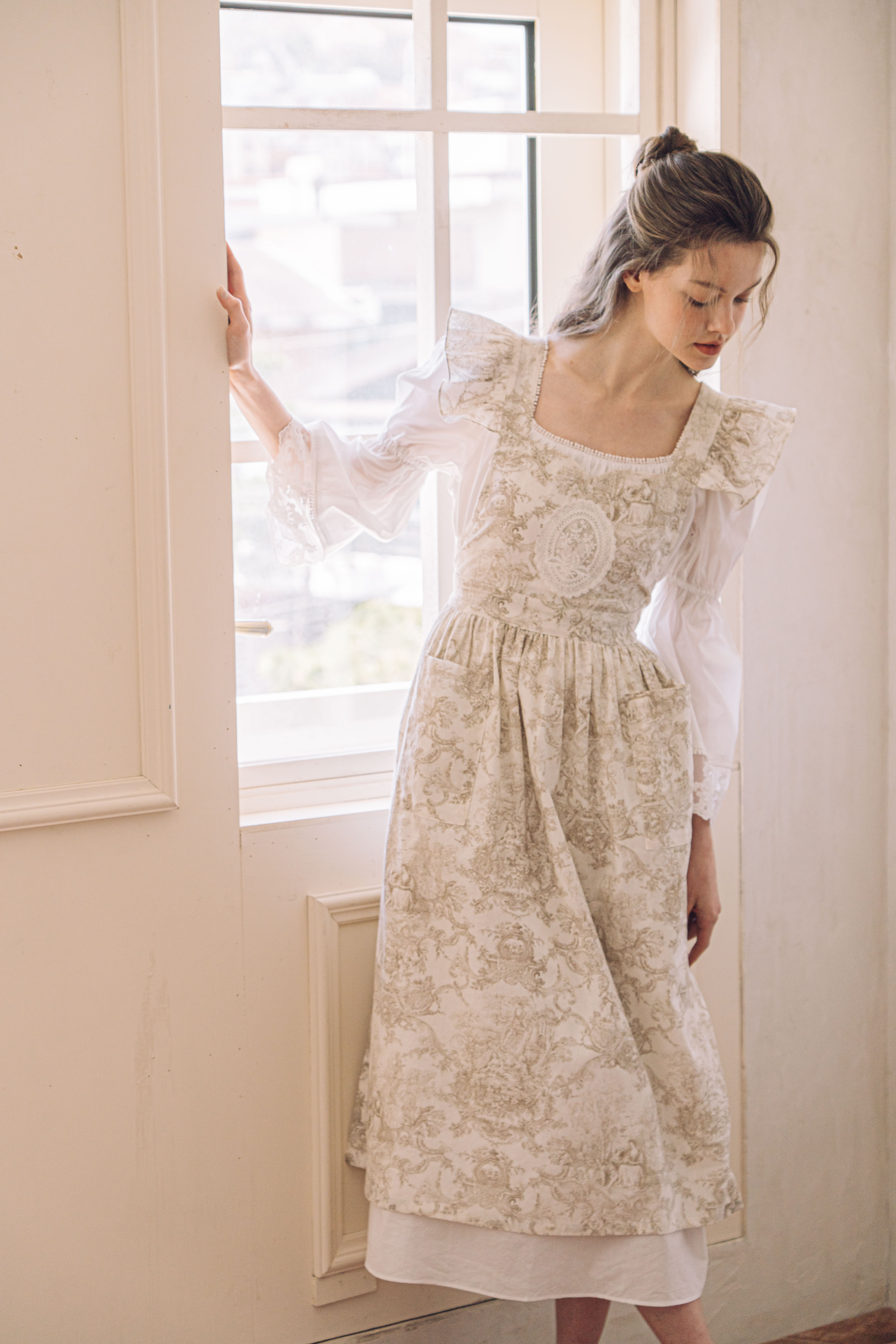 - 하트 모양의 가슴판 , 허릿단 셔링과 어깨 프릴의 포인트로 허리 라인은 잘록하고 스커트 라인은 풍성한 원피스 형 앞치마.