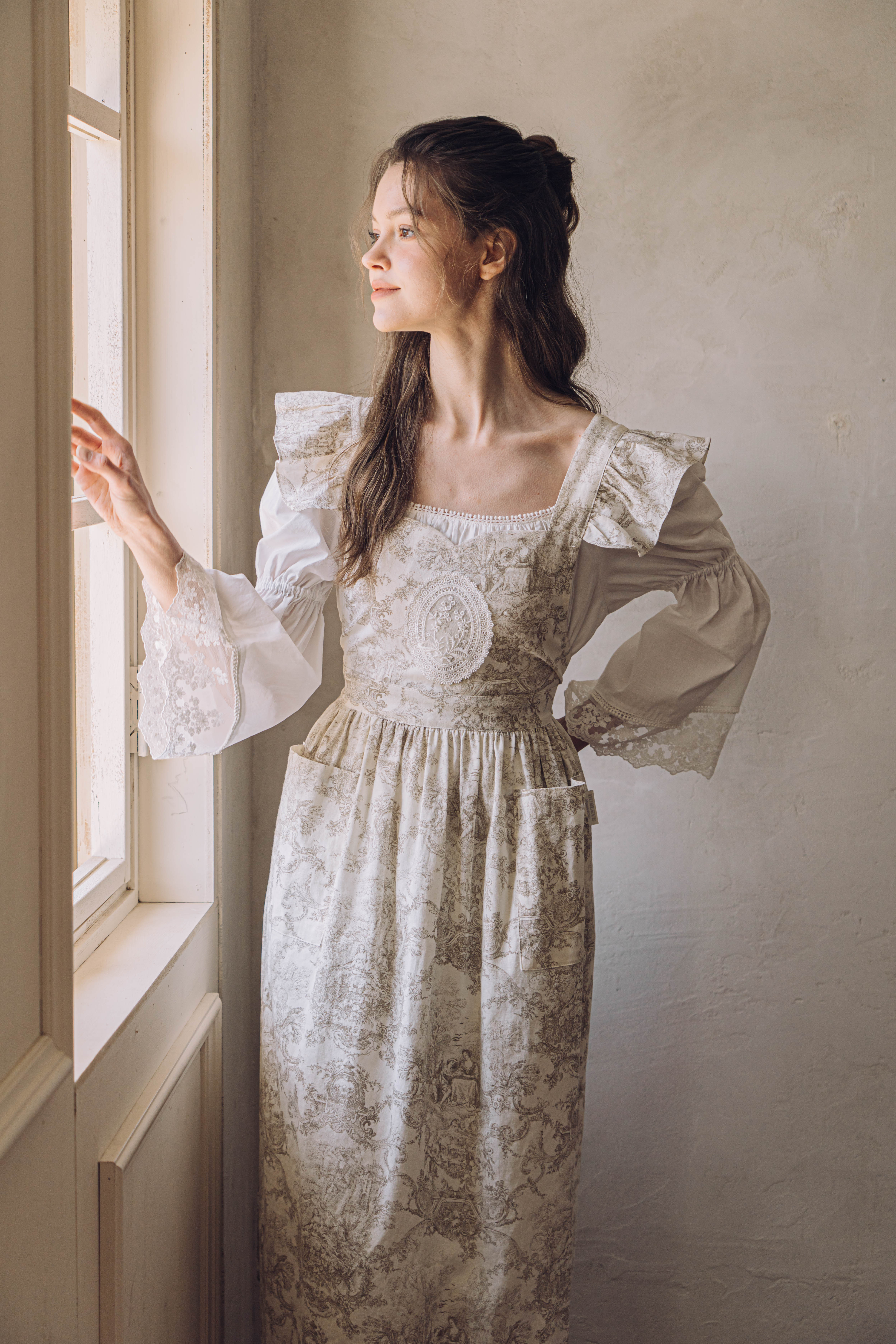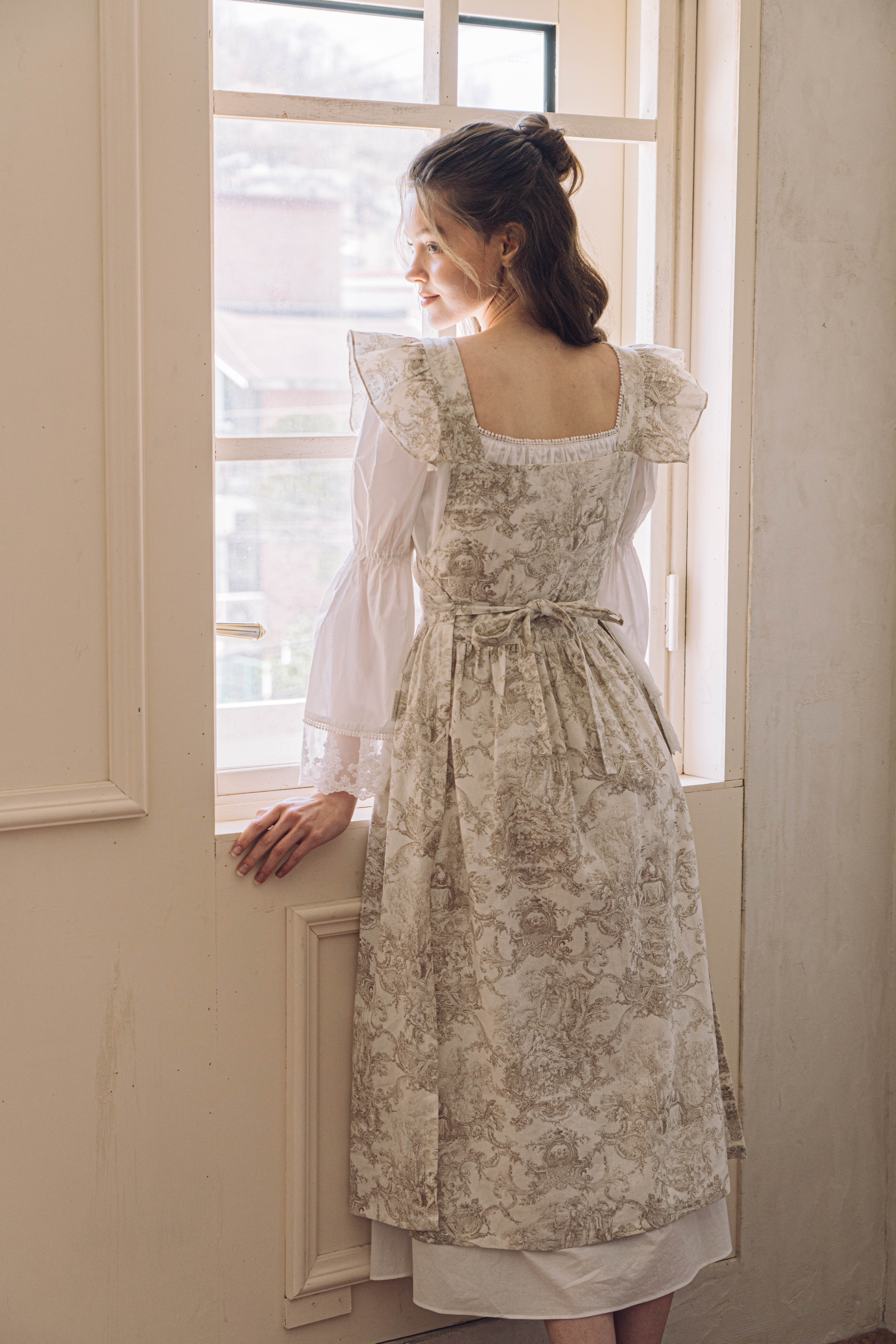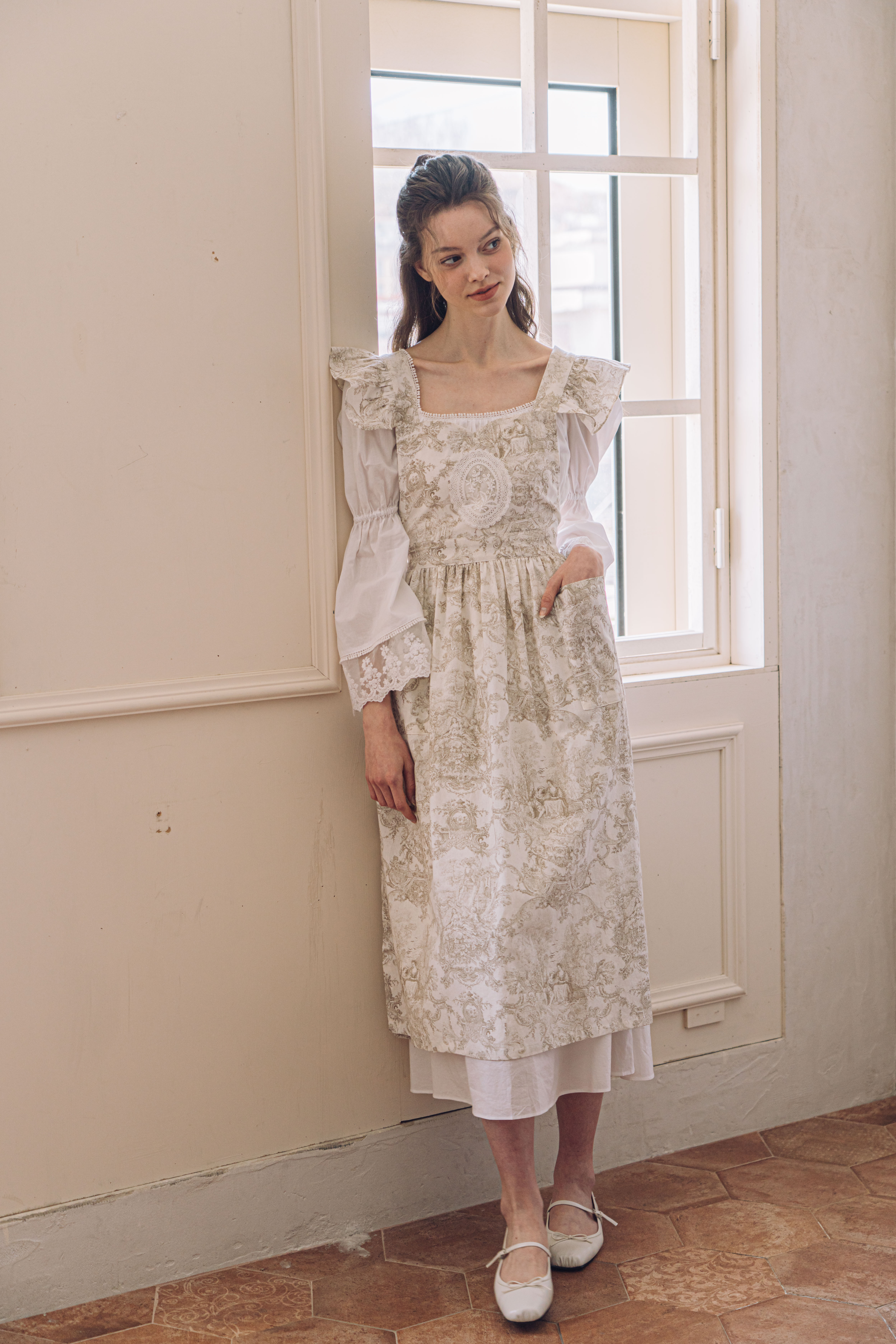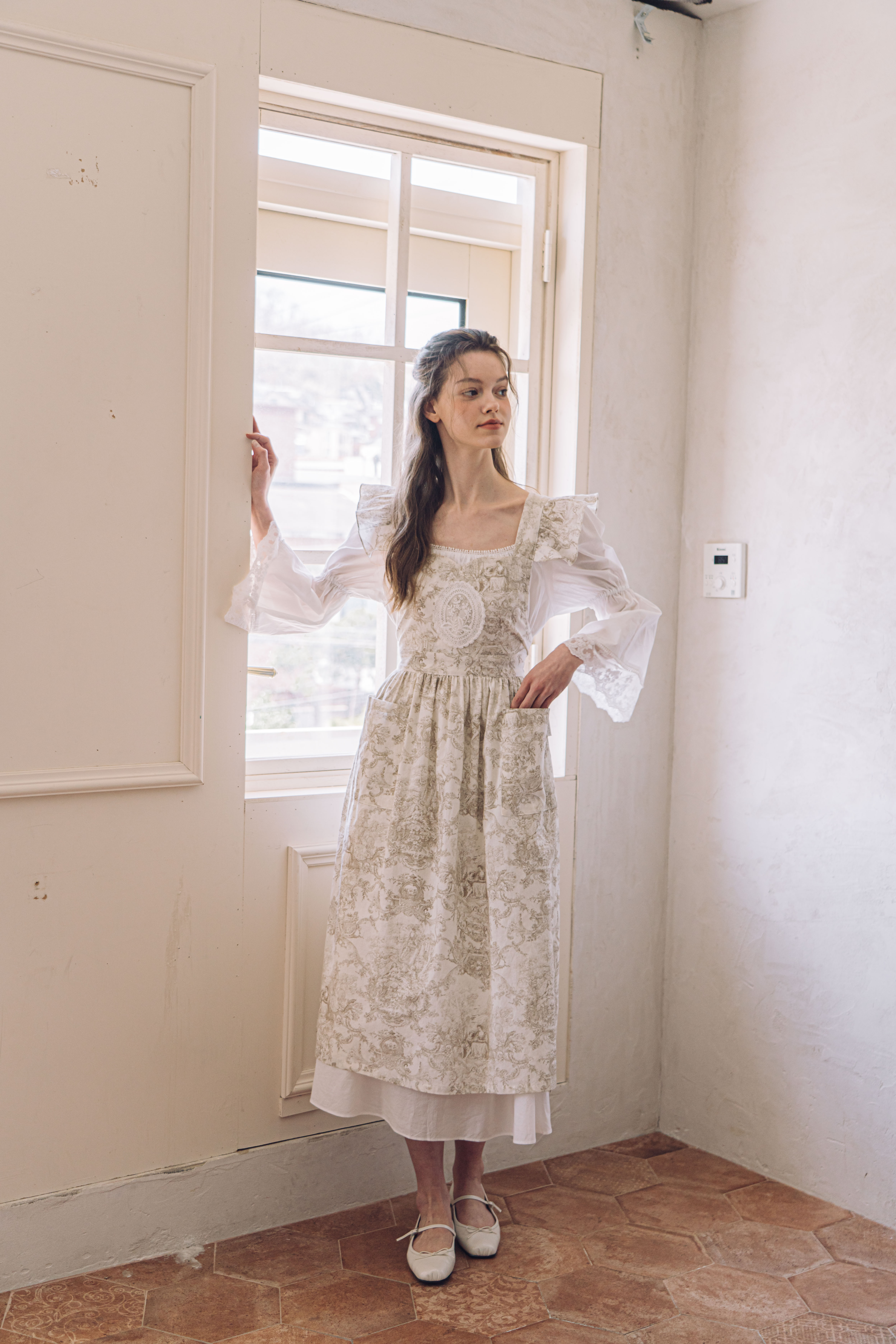 - 하트 모양의 가슴판 , 허릿단 셔링과 어깨 프릴의 포인트로 허리 라인은 잘록하고 스커트 라인은 풍성한 원피스 형 앞치마.