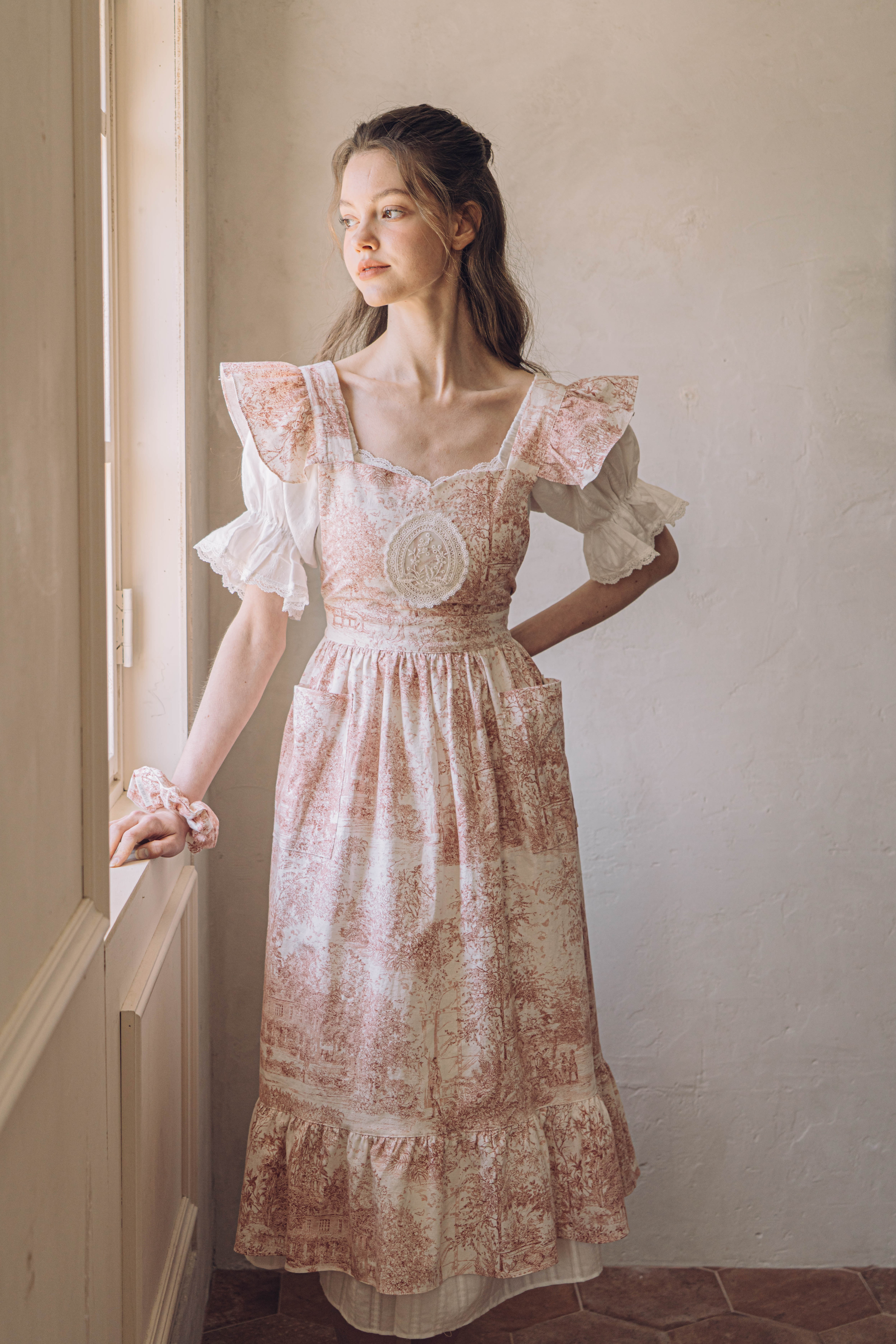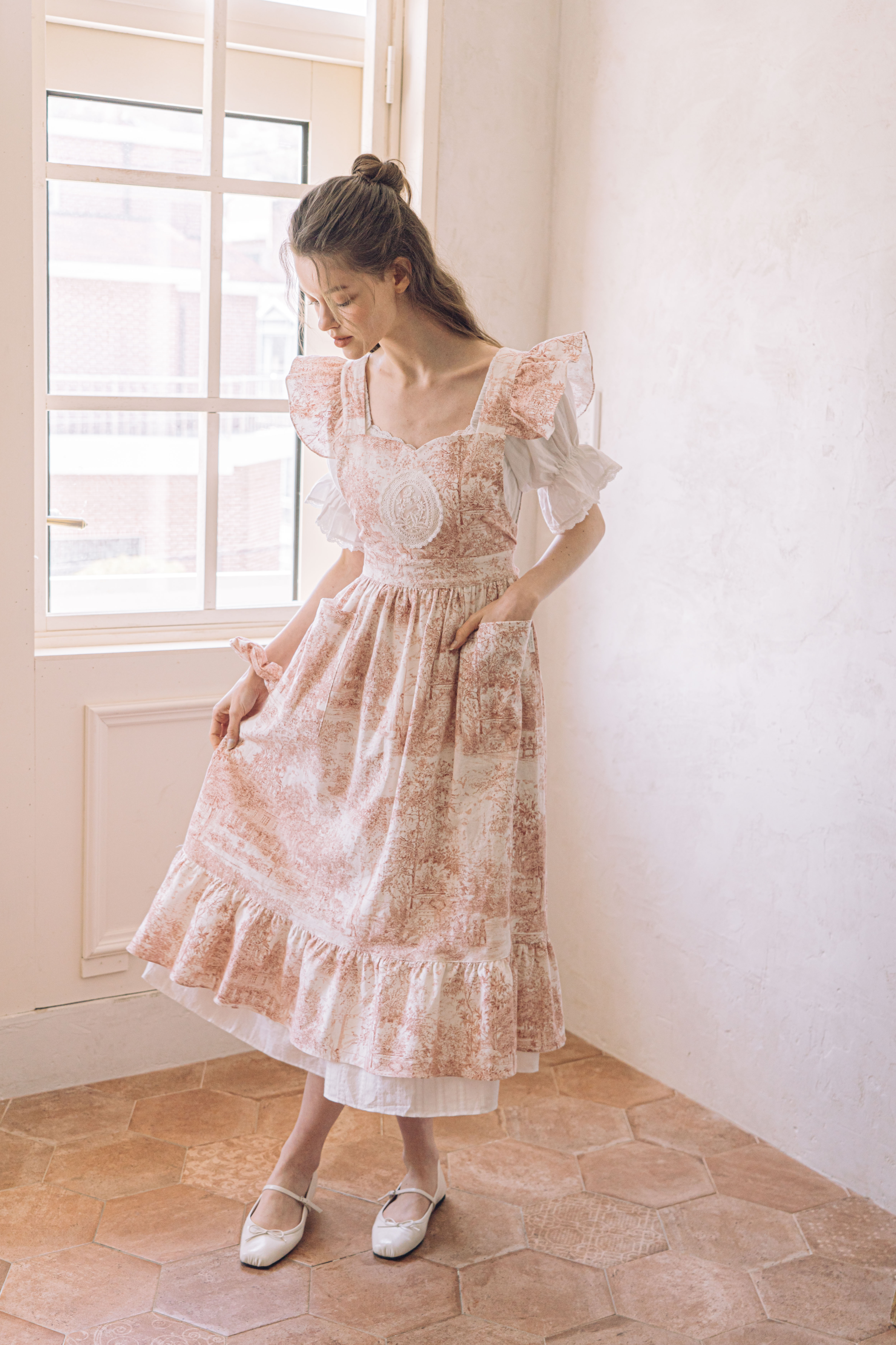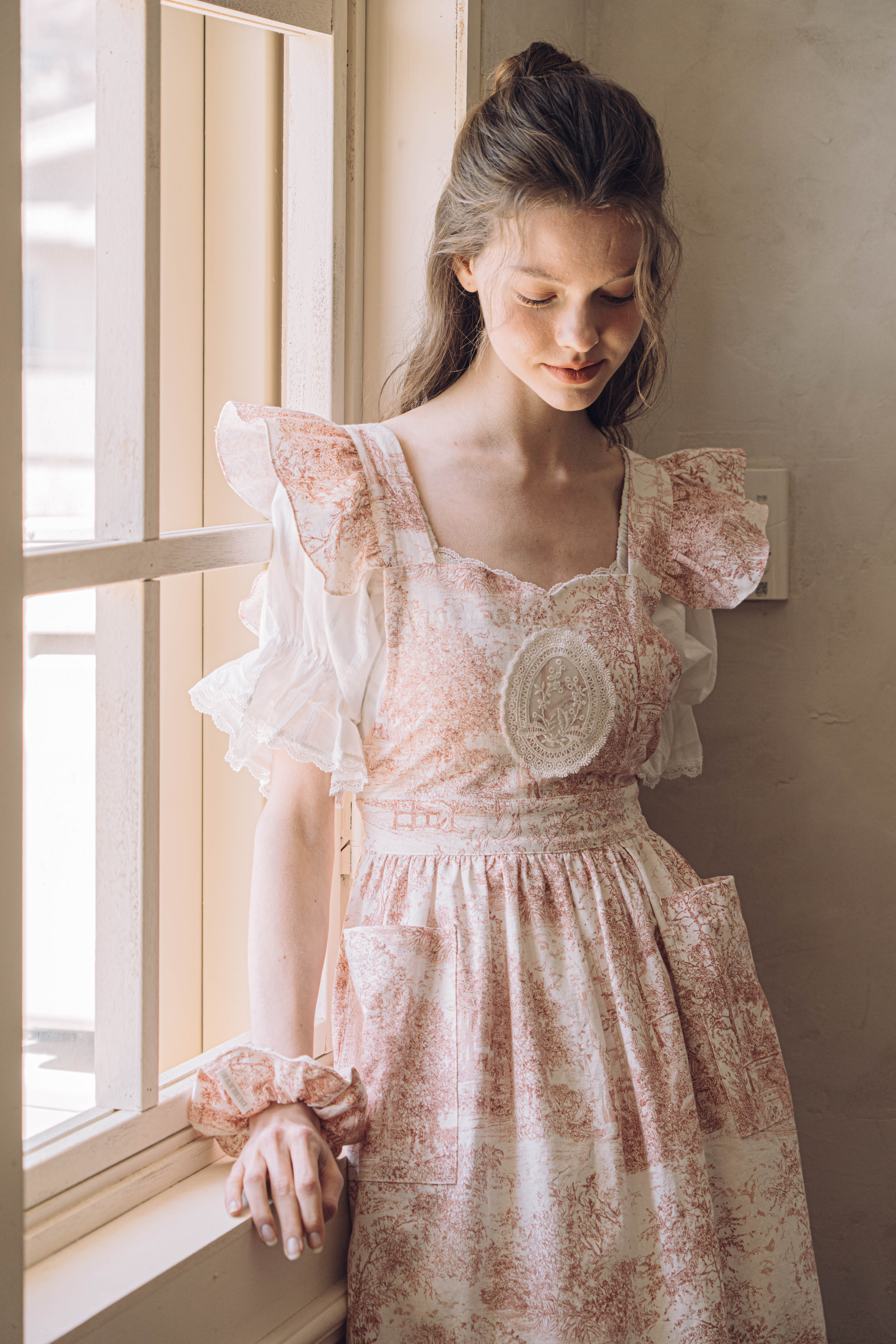 - 하트 모양의 가슴판 , 허릿단 셔링과 어깨 프릴의 포인트로 허리 라인은 잘록하고 스커트 라인은 풍성한 원피스 형 앞치마.