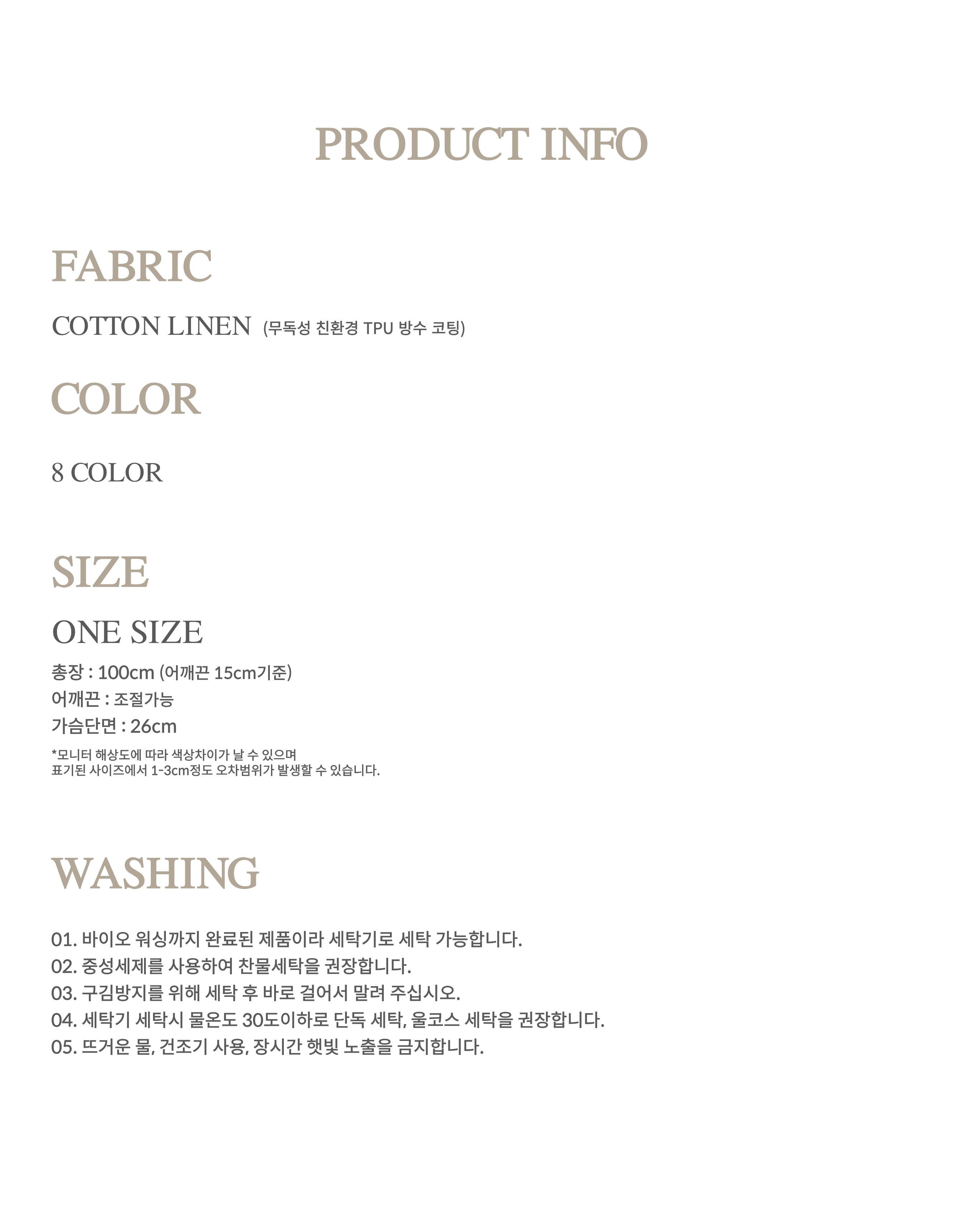 - 고급 면린넨 바이오 워싱, 무독성 친환경 TPU코팅까지 완료 된 생활 방수 앞치마